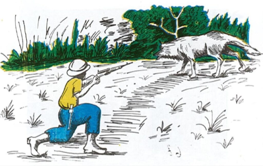 Hashize akanya, umuhigi ahinguka hirya afite imbunda ku rutugu n’inkota mu bitugu. Umuhari uti “Dore noneho umuntu araje, genda umufate, jyewe nigiriye mu mwobo wanjye.” Nuko isega igenda igira ngo ifate wa muntu; imugeze iruhande wa muhigi ntiyatinya, ayikubita isasu hagati y’amaso, isega ntiyabyitaho, izinga umunya ikomeza kumusatira. Umuhigi arongera ayikubita irindi sasu. Isega irihangana iramwegera cyane.