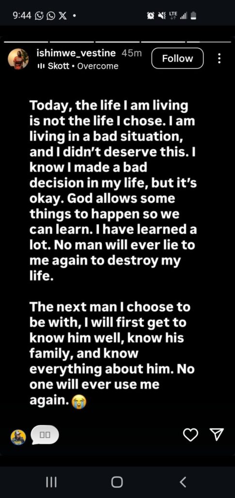 Abinyujije kuri Instagram ahajya ubutumwa bumara amasaha 24, Vestine yagize ati “Uyu munsi ubuzima mbayemo si bwo nahisemo. Mbayeho mu buryo bubi, ntabwo mbikwiriye.”